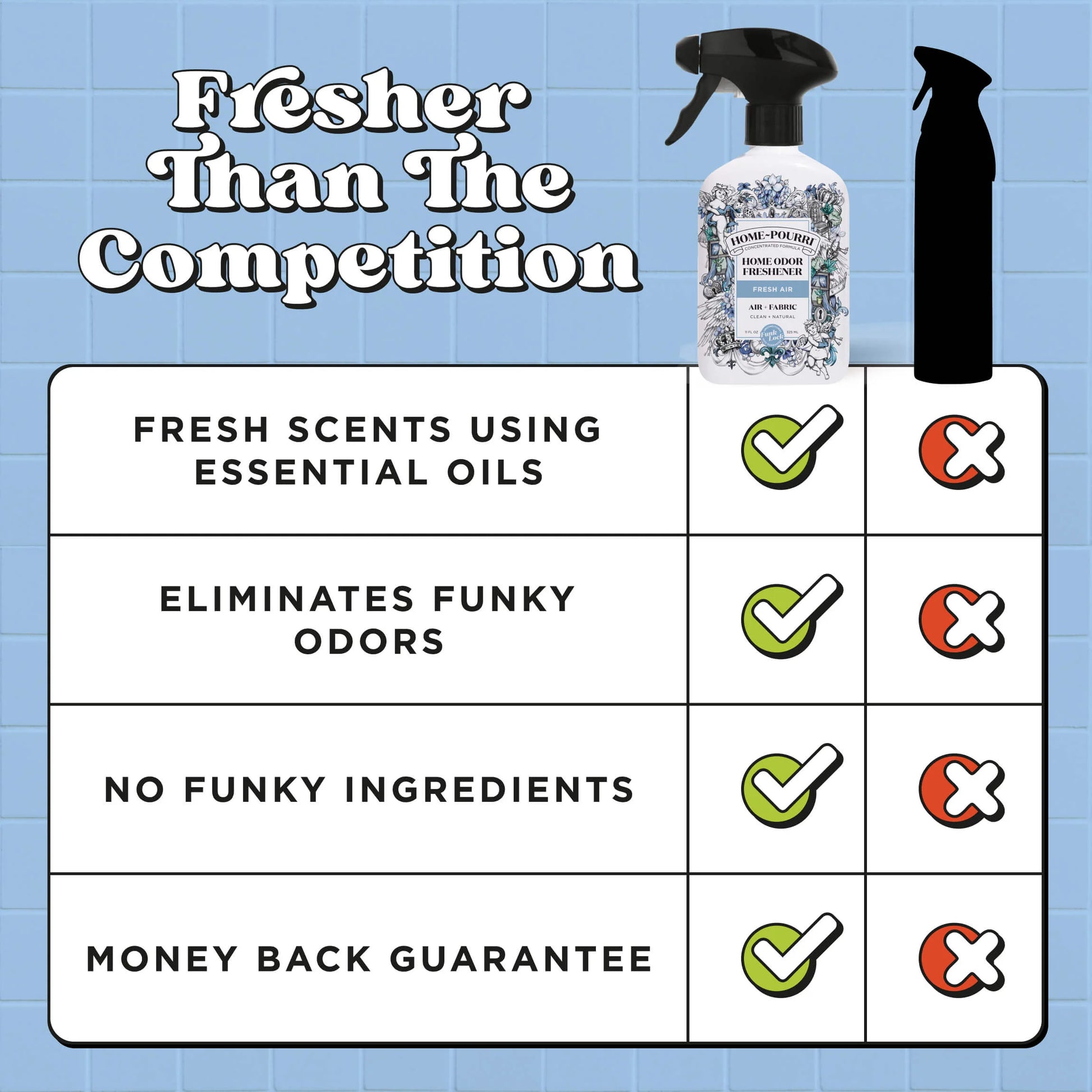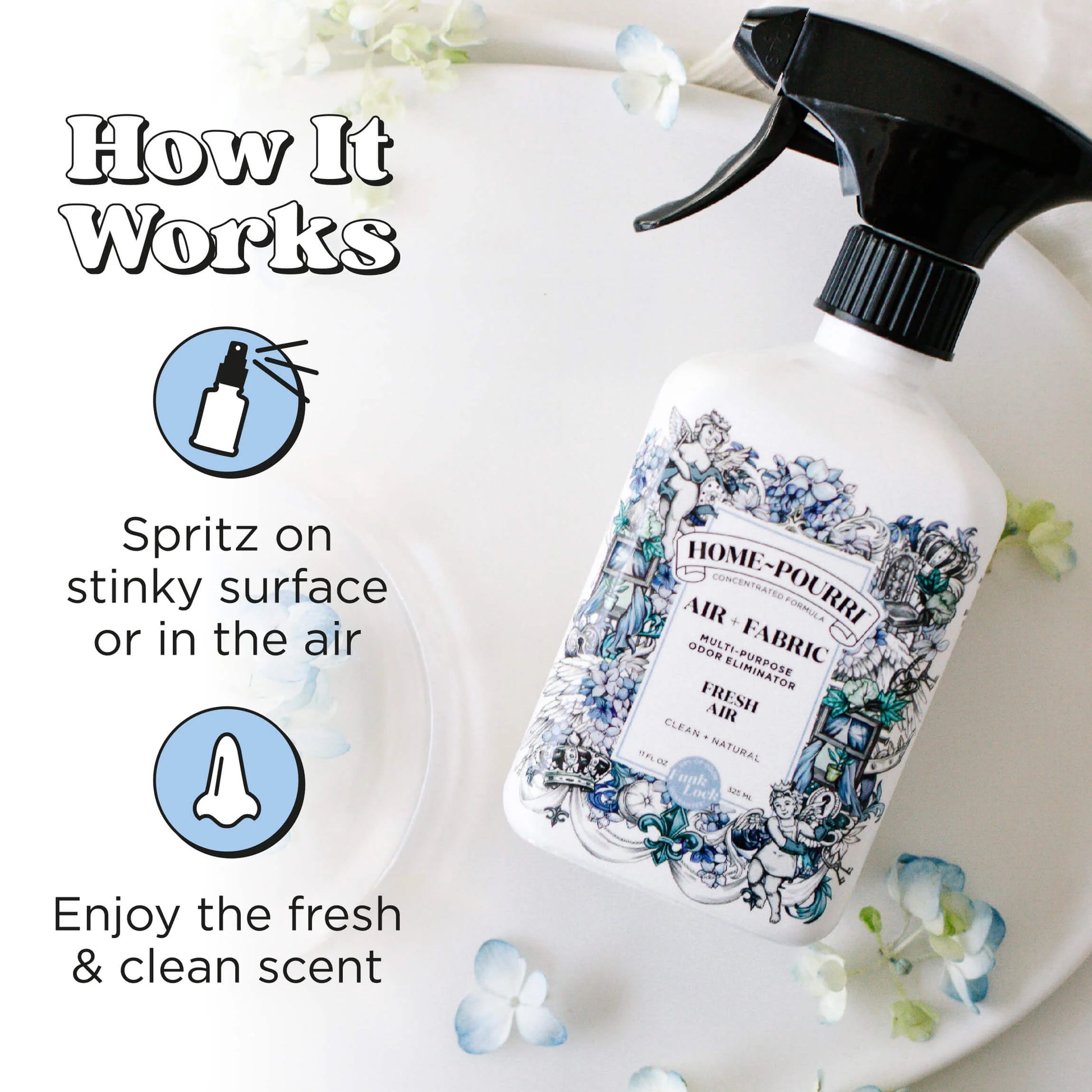 No need to open the window to smell a fresh breeze. Fill the room with Home~Pourri Fresh Air. This complex, yet clean scent is a blend of intoxicating florals like jasmine and gardenia, paired with crisp fruits like pineapple and pear, and balanced with warm notes of vanilla and tonka. Picture this: It's a brisk Spring day. You're driving, top down, on the winding roads of the country hillside. The crisp, virgin air is funneling straight up your nose and blowing your hair back like Beyoncé. That smell? Yeah, we bottled it and brought it to your living room.
