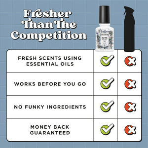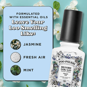 No need to open the bathroom window to smell a fresh breeze. Fill the room with Poo~Pourri Fresh Air. This complex, yet clean scent is a blend of intoxicating florals like jasmine and rose, cooling mints like peppermint and spearmint, and zesty citruses like lemon and bergamot orange. Picture this: It's a brisk Spring day. You're driving, top down, on the winding roads of the country hillside. The crisp, virgin air is funneling straight up your nose and blowing your hair back like Beyoncé. That smell? Yeah, we bottled it and brought it to your bathroom.