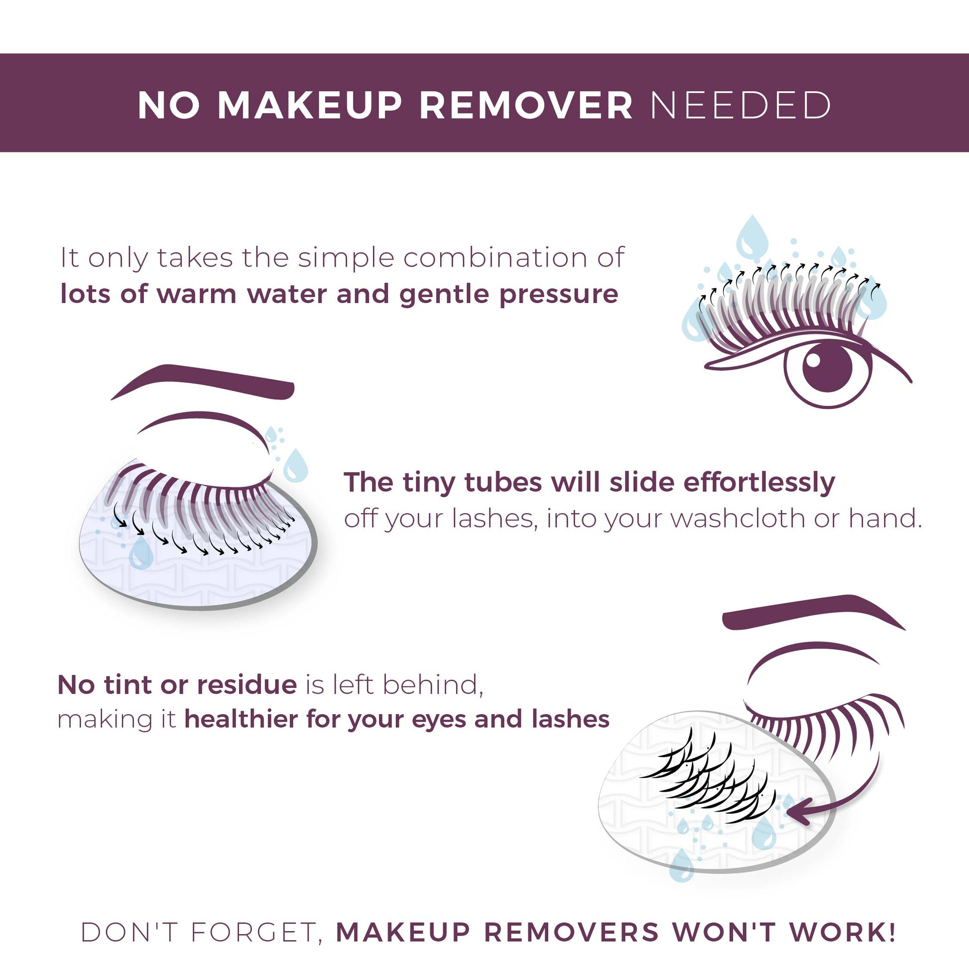 To remove, skip makeup removers, they will not work. Use plenty of warm water and gentle pressure with your fingertips, a washcloth, or a cotton round. The tiny tubes will release and slide off into your hand. Don’t worry, it’s not your lashes, it’s our tiny, beautiful blinc tubes. If removal feels difficult, simply saturate your lashes with more water.